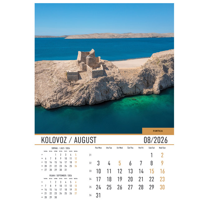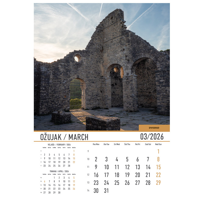 Kalendar Dvorci i utvrde 2026 13 listova spirala dimenzija: 33×48 cm; pasica za dotisak 6 cm; spirala. Mogućnost tiska na kalendar po želji kupca.